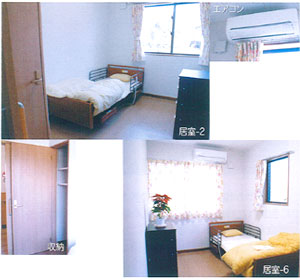 居室は全室個室で、エアコン・タンス・収納・電動ベッドが設置してあります。毛布以外の枕・掛け布団・シーツなどの寝具類も当施設でご準備しております。